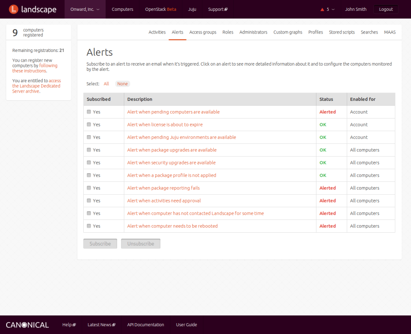Landscape uses alerts to notify administrators of conditions that require attention. The following types of alerts are available: